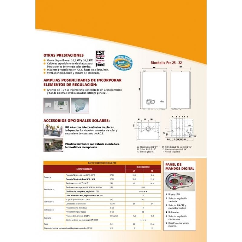 BLUEHELIX PRO Ferroli es una caldera que tiene un intercambiador de acero y calentador de agua sanitaria integrado, de alto rendimiento y muy bajas emisiones, con sistema de premezcla y condensación, alimentado con gas natural y puede adaptarse a gas butano y propano, la adaptación sa hará sobre demanda y dotado de sistema de control con microprocesador, es de cámara estanca y se puede instalar en el interior o en el exterior, protegido con temperaturas no inferiores a —5 °C.