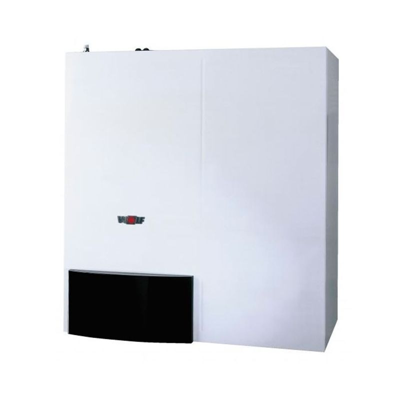 Caldera de condensación Wolf CGW 24/140 mural mixta con una potencia de 23,1 kW en calefacción y 27,6 kW para producción de Agua Caliente Sanitaria con interacumulador de 140 litros. Disponible en Gas Natural y propano.