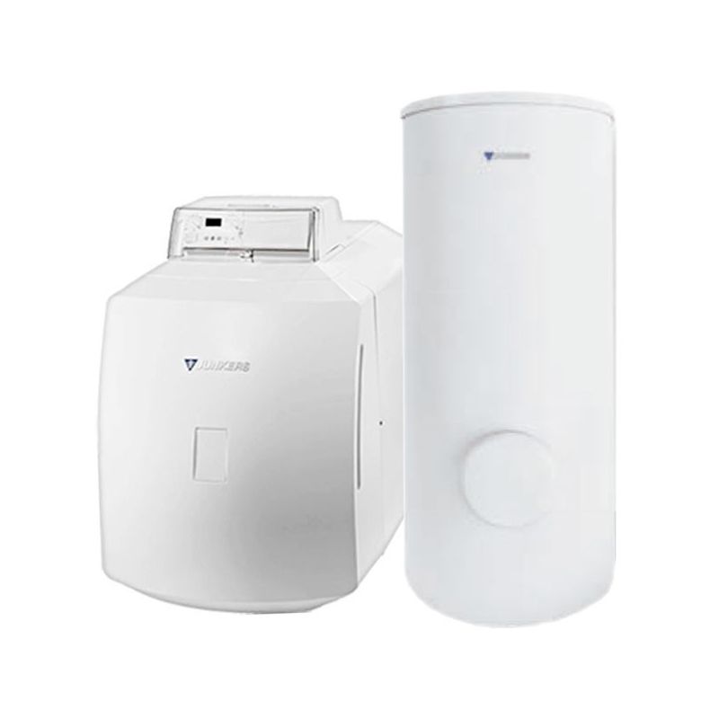 Caldera de pie a gasóleo de baja temperatura Junkers Suprastar-O KU 34 con regulación EMS, sonda de acs y acumulador vertical. Modelo de 34 kW en calefacción y a.c.s.. Esta caldera dispone de 49 + 160, 200 ó 300 litros de contenido de agua.
