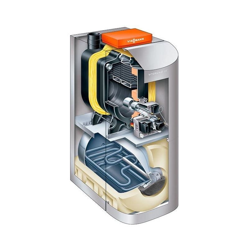 La Vitorond 111, compacta y lista para instalar, es la combinación de la caldera de baja temperatura a gasóleo, Vitorond 100, y un acumulador de A.C.S. con capacidad para 130 o 160 litros (según la potencia de la caldera). Ocupa menos de 0,6 m2 y la caldera y su centralita de regulación tienen una altura inferior a 1,60 m.