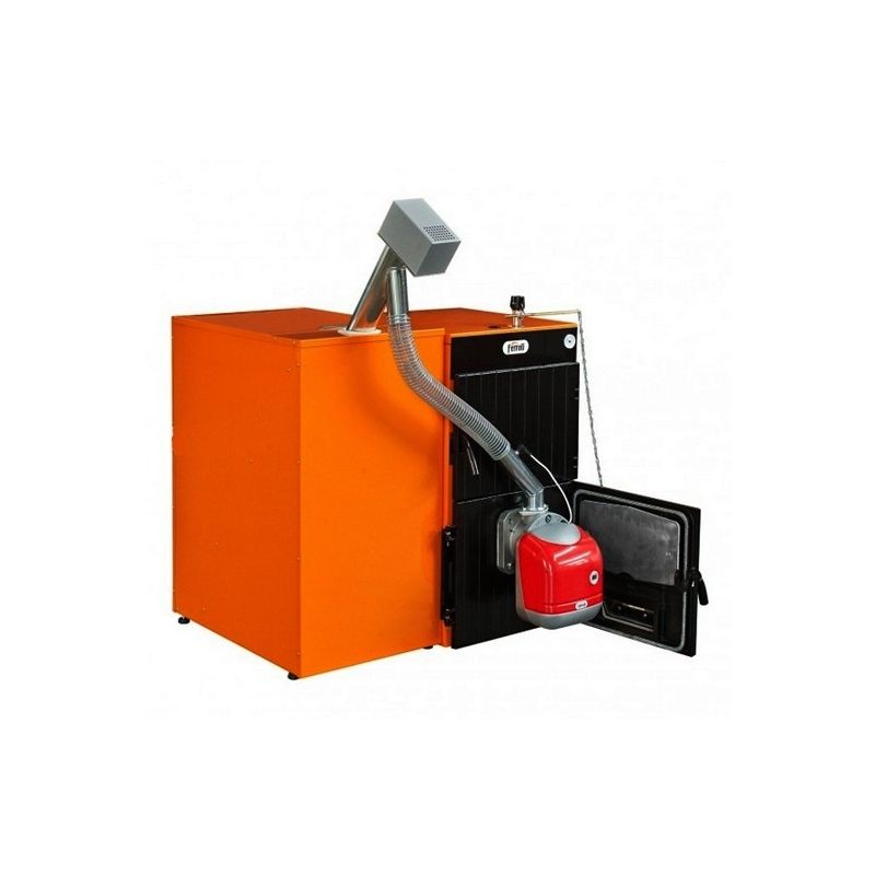 Caldera Policombustible, Ferroli SFL 6. on una potencia de 42 a 52.5 kW, solo calefacción. Funciona con leña o carbón y mediante un kit funciona con pellets. Caldera de pie doméstica de hierro fundido.