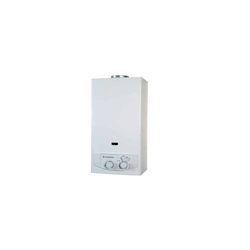 Calentador de cámara estanca, Ariston Fast 14 F. Potencia de 27 kW en ACS, características de las dimensiones muy compactas. Encendido Piezoeléctrico y con un caudal de agua de 14 l/min (ideal para un baño y cocina), de Tiro Natural. Disponible en Gas natural y butano/propano.